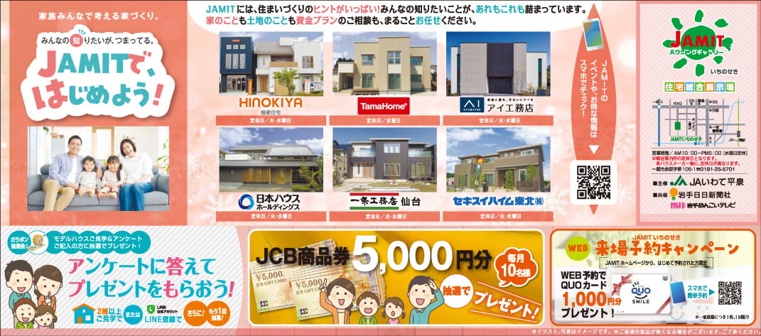 JAMIT一関ではアンケート抽選会を開催中✍🏻 期間中モデルハウスを🏠ご見学して👀 アンケートにお答えの方に抽選で🎯 JCB商品券5,000円分が当たるチャンス!✨ またWEB来場予約キャンペーンも同時開催! JAMIT一関ホームページからWEB来場予約をされた方に、クオカード1,000円分をプレゼント!※はじめての方限定